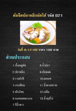 ต้มจืดปลาหมึกยัดใส้ รหัส 021 วันที่ 9/12/60 ราคา 190 บาท ส่วนประกอบ 1.เนื้อหมูสับ 8.น ้าปลา 2.ปลาหมึก 9.ต้นหอม 3.รากผักชี 10.แครอท 4.กระเทียม 11.น ้าตาลทราย 5.พริกไทย 12.เกลือ 6.ซอสหอยนางรม 13.น ้าซุปไก่ 7.ซีอิ้วขาว