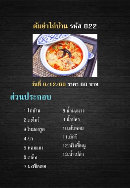 ต้มย าไก่บ้าน รหัส 022 วันที่ 9/12/60 ราคา 60 บาท ส่วนประกอบ 1.ไก่บ้าน 8.น ้ามะนาว 2.ตะไคร้ 9.น ้าปลา 3.ใบมะกรูด 10.ต้นหอม 11.ผักชี 4.ข่า 12.พริกขี้หนู 5.หอมแดง 13.น ้าเปล่า 6.เกลือ 7.มะเขือเทศ