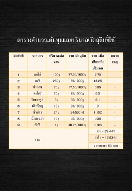 ตารางค านวณต้นทุนและปริมาณวัตถุดิบที่ใช้