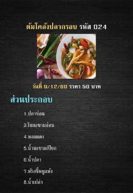 ต้มโคล้งปลากรอบ รหัส 024 วันที่ 9/12/60 ราคา 50 บาท ส่วนประกอบ 1.ปลาช่อน 3.ใบมะขามอ่อน 4.หอมแดง 5.น ้ามะขามเปียก 6.น ้าปลา 7.พริกขี้หนูแห้ง 8.น ้าเปล่า