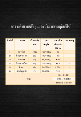 ตารางค านวณต้นทุนและปริมาณวัตถุดิบที่ใช้