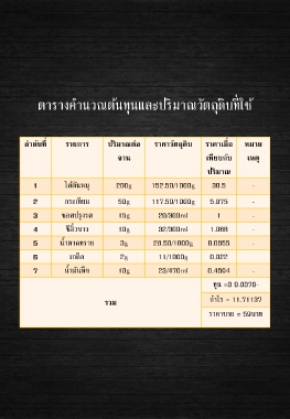ตารางค านวณต้นทุนและปริมาณวัตถุดิบที่ใช้
