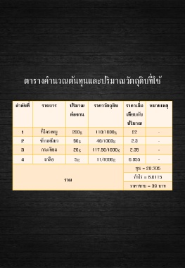 ตารางค านวณต้นทุนและปริมาณวัตถุดิบที่ใช้