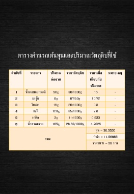 ตารางค านวณต้นทุนและปริมาณวัตถุดิบที่ใช้