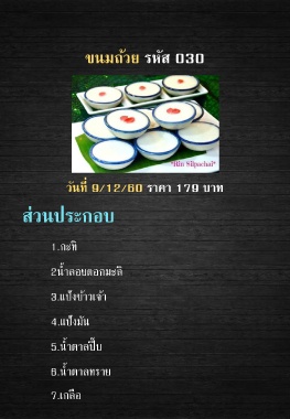 ขนมถ้วย รหัส 030 วันที่ 9/12/60 ราคา 179 บาท ส่วนประกอบ 1.กะทิ 2น ้าลอยดอกมะลิ 3.แป้งข้าวเจ้า 4.แป้งมัน 5.น ้าตาลปี๊บ 6.น ้าตาลทราย 7.เกลือ