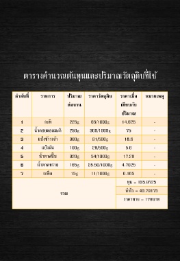ตารางค านวณต้นทุนและปริมาณวัตถุดิบที่ใช้