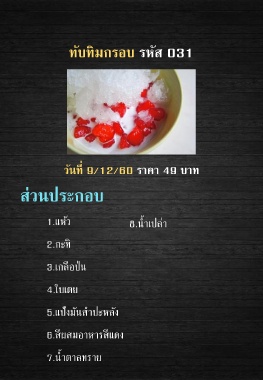 ทับทิมกรอบ รหัส 031 วันที่ 9/12/60 ราคา 49 บาท ส่วนประกอบ 1.แห้ว 8.น ้าเปล่า 2.กะทิ 3.เกลือป่น 4.ใบเตย 5.แป้งมันส าปะหลัง 6.สีผสมอาหารสีแดง 7.น ้าตาลทราย