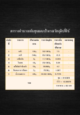 ตารางค านวณต้นทุนและปริมาณวัตถุดิบที่ใช้