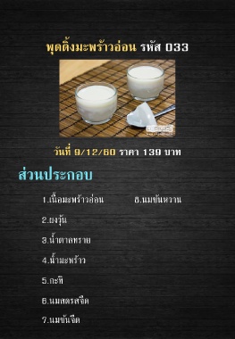 พุดดิ้งมะพร้าวอ่อน รหัส 033 วันที่ 9/12/60 ราคา 139 บาท ส่วนประกอบ 1.เนื้อมะพร้าวอ่อน 8.นมข้นหวาน 2.ผงวุ้น 3.น ้าตาลทราย 4.น ้ามะพร้าว 5.กะทิ 6.นมสดรสจืด 7.นมข้นจืด