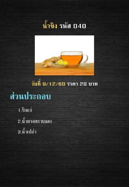 น ้าขิง รหัส 040 วันที่ 9/12/60 ราคา 20 บาท ส่วนประกอบ 1.ขิงแก่ 2.น ้าตาลทรายแดง 3.น ้าเปล่า