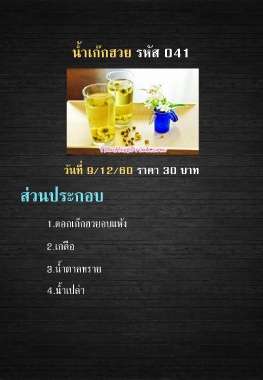 น ้าเก๊กฮวย รหัส 041 วันที่ 9/12/60 ราคา 30 บาท ส่วนประกอบ 1.ดอกเก๊กฮวยอบแห้ง 2.เกลือ 3.น ้าตาลทราย 4.น ้าเปล่า