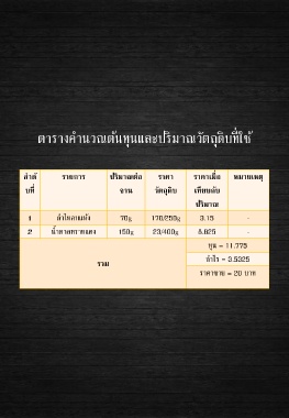 ตารางค านวณต้นทุนและปริมาณวัตถุดิบที่ใช้ ล าดั รายการ ปริมาณต่อ ราคา ราคาเมื่อ หมายเหตุ บที่ จาน วัตถุดิบ เทียบกับ ปริมาณ 1 ล าไยอบแห้ง 70g 170/250g 3.15 - 2 น ้าตาลทรายแดง 150g 23/400g 8.625 - ทุน = 11.775 ก าไร = 3.5325 รวม ราคาขาย = 20 บาท