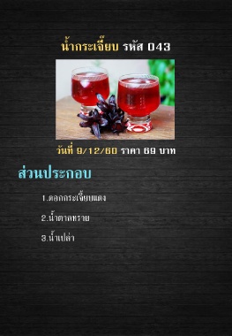 น ้ากระเจี๊ยบ รหัส 043 วันที่ 9/12/60 ราคา 69 บาท ส่วนประกอบ 1.ดอกกระเจี้ยบแดง 2.น ้าตาลทราย 3.น ้าเปล่า