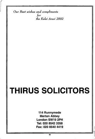 50 M Fax: 020 8540 4419 Tel: 020 8542 3358 London SW19 2PH Merton Abbey 114 Runnymede THIRUS SOLICITORS the KaJai Arasi 2002 for Our Best wishes and compliments A