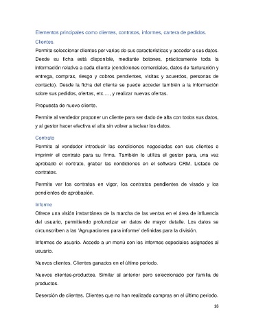 Elementos principales como clientes, contratos, informes, cartera de pedidos.