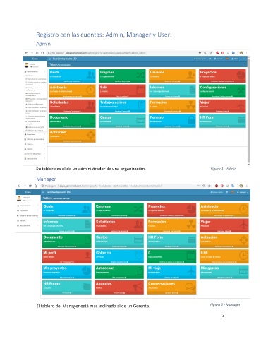 Registro con las cuentas: Admin, Manager y User. Admin Su tablero es el de un administrador de una organización. Figura 1 - Admin Manager El tablero del Manager está más inclinado al de un Gerente. Figura 2 - Manager 3