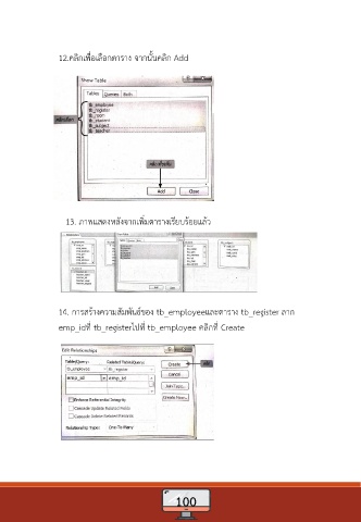 12.คลิกเพื่อเลือกตาราง จากนั้นคลิก Add 13. ภาพแสดงหลังจากเพิ่มตารางเรียบร้อยแล้ว 14. การสร้างความสัมพันธ์ของ tb_employeeและตาราง tb_register ลาก emp_idที่ tb_registerไปที่ tb_employee คลิกที่ Create 100