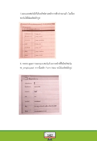 7.ออกแบบฟอร์มให้ได้ผลลัพธ์ตามหลักการที่กล่าวมาแล้ว ในเรื่อง ฟอร์มให้ได้ผลลัพธ์ดังรูป 8. ทดสอบดูผลการออกแบบฟอร์มด้วยการคลิกที่ชื่อไฟล์ฟอร์ม tb_employee1 จากนั้นคลิก Form View จะได้ผลลัพธ์ดังรูป 142
