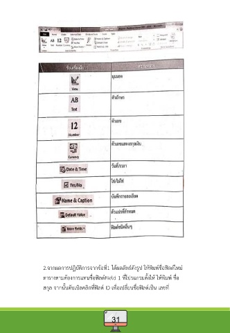 2.จากผลการปฎิบัติการจากข้อที่1 ได้ผลลัพธ์ดังรูป ให้พิมพ์ชื่อฟิลด์ใหม่ ตารางตามต้องการแทนชื่อฟิลด์Field 1 ที่โปรแกรมตั้งให้ ให้พิมพ์ ชื่อ สกุล จากนั้นดับเบิลคลิกที่ฟิลด์ ID เพื่อเปลี่ยนชื่อฟิลด์เป็น เลขที่ 31