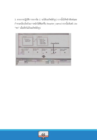 3. จากการปฏิบัติการจากข้อ 2. จะได้ผลลัพธ์ดังรูป จากนั้นให้คลิกฟิลด์และ กําหนดเงื่อนไขด้วยการคลิกใต้ฟิลด์ชื่อ (teacter_name) จากนั้นพิมพ์ Like “พร” เมื่อสั่งรันได้ผลลัพธ์ดังรูป 66