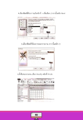 4.เลือกฟิลด์ที่ต้องการแล้วคลิกที่ > เพื่อเลือก 2 จากนั้นคลิก Next 5.เลือกฟิลด์ที่ต้องการออกรายงาน จากนั้นคลิก 3 6.ตั้งชื่อของรายงาน เลือก Modify คลิกที่ Finish 90