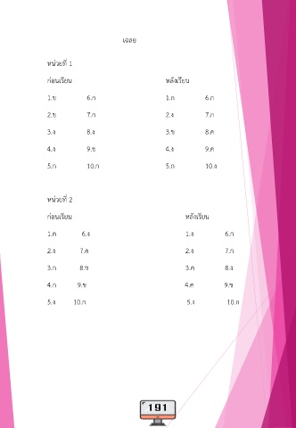 เฉลย หน่วยที่ 1 ก่อนเรียน หลังเรียน 1.ข 6.ก 1.ก 6.ก 2.ข 7.ก 2.ง 7.ก 3.ง 8.ง 3.ข 8.ค 4.ง 9.ข 4.ง 9.ค 5.ก 10.ก 5.ก 10.ง หน่วยที่ 2 ก่อนเรียน หลังเรียน 1.ค 6.ง 1.ง 6.ก 2.ง 7.ค 2.ง 7.ก 3.ก 8.ข 3.ค 8.ง 4.ก 9.ข 4.ค 9.ข 5.ง 10.ก 5.ง 10.ก 191
