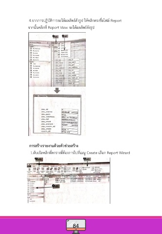 4.จากการปฏิบัติการจะได้ผลลัพธ์ดังรูป ให้คลิกตรงชื่อไฟล์ Report จากนั้นคลิกที่ Report View จะได้ผลลัพธ์ดังรูป กำรสร้ำงรำยงำนด้วยตัวช่วยสร้ำง 1.ดับเบิลคลิกที่ตารางที่ต้องการไปที่เมนู Create เลือก Report Wizard 84