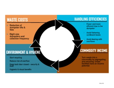 Fewer and more efficient trips to the dumpster Avoid flattening cardboard boxes Avoid dealing with overflows Commodity income Turn waste into a commodity by segregating and recycling. Urban facilities have an income 20 of 23