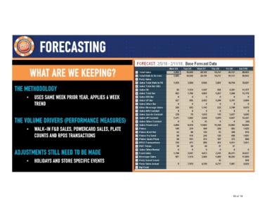 The methodology Uses same week prior year, applies 6 week • trend The volume drivers (performance measures) Walk-In F&B Sales, Powercard Sales, Plate • Counts and RPOS Transactions Adjustments still need to be made Holidays and store specific events •