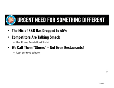 17 Urgent need for something different 17 of 50 Not Even Restaurants! The Mix of F&B Has Dropped to 45% Competitors Are Talking Smack Rec Room, Punch Bowl Social We Call Them “Stores” – Lost our food culture – – • • •