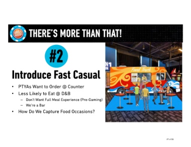 27 27 of 50 There’s more than that! Less Likely to Eat @ D&B #2 Introduce Fast Casual PTYAs Want to Order @ Counter Don’t Want Full Meal Experience (Pre-Gaming) How Do We Capture Food Occasions? We’re a Bar – – • • •