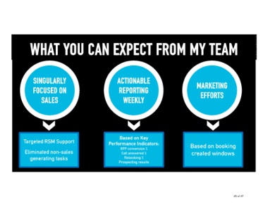 Actionable Reporting weekly Based on Key Performance Indicators: RFP conversion % Call answered % Rebooking % Prospecting results