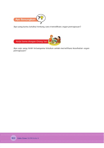 Apa yang kamu ketahui tentang cara memelihara organ pernapasan? Apa saja yang telah keluargamu lakukan untuk memelihara kesehatan organ pernapasan? 102 Buku Siswa SD/MI Kelas V