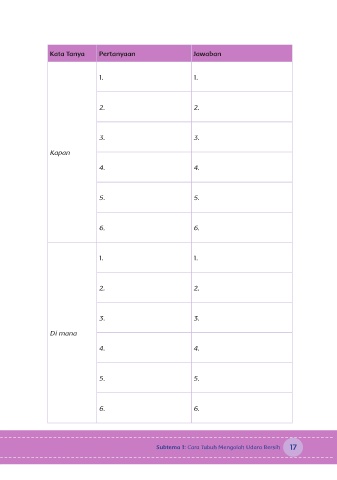 Kata Tanya Pertanyaan Jawaban 1. 1. 2. 2. 3. 3. Kapan 4. 4. 5. 5. 6. 6. 1. 1. 2. 2. 3. 3. Di mana 4. 4. 5. 5. 6. 6. Subtema 1: Cara Tubuh Mengolah Udara Bersih 17