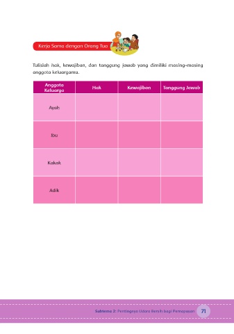 Tulislah hak, kewajiban, dan tanggung jawab yang dimiliki masing-masing anggota keluargamu. Anggota Keluarga Hak Kewajiban Tanggung Jawab Ayah Ibu Kakak Adik Subtema 2: Pentingnya Udara Bersih bagi Pernapasan 71