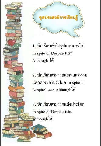 1. นักเรียนเข้าใจรูปแบบการใช้ In spite of Despite และ Although ได้ 2. นักเรียนสามารถแยกแยะความ แตกต่างของประโยค In spite of Despite' และ Althoughได้ 3. นักเรียนสามารถแต่งประโยค In spite of Despite และ Althoughได้