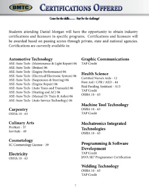 Automotive II, Graphics & Printing II, Building Construction II, Cosmetology, certifications and licensure in specific programs. Certifications and licensure will