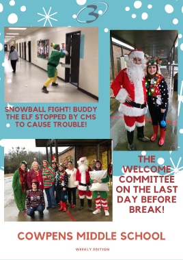 SNOWBALL FIGHT! BUDDY THE ELF STOPPED BY CMS TO CAUSE TROUBLE! THE WELCOME COMMITTEE ON THE LAST DAY BEFORE BREAK! COWPENS MIDDLE SCHOOL WEEKLY EDITION