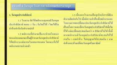 ของแต่ละแผนกจะเป็นผู้ก าหนดวันหยุดประจ าสัปดาห์ ภายใน 1 งวดค่าจ้าง ไม่อนุญาตให้สะสมเกิน 1 งวด