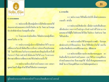 5.3 พนักงานหญิงมีครรภ์มีสิทธิขอให้โรงแรม พักผ่อนประจ าปีหมดก่อน จึงจะใช้สิทธิลากิจได้ ยกเว้น