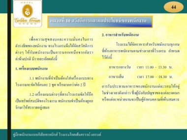 โรงแรมจะจัดให้คนละ 2 ชุด หรือมากกว่าต่อ 2 ป ี การรับประทานอาหารของพนักงานแต่ละรอบให้อยู่