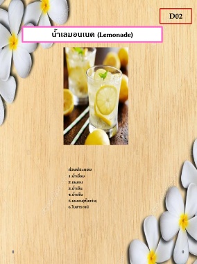 D02 น ้าเลมอนเนด (Lemonade) ส่วนประกอบ 1.น ้าเชื่อม 2.เลมอน 3.น ้าเย็น 4.น ้าแข็ง 5.เลมอน(หั่นแว่น) 6.ใบสาระแน่