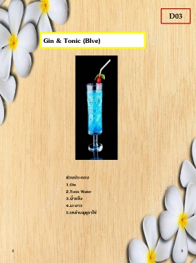 D03 Gin & Tonic (Blve) ส่วนประกอบ 1.Gin 2.Tonic Water 3.น ้าแข็ง 4.มะนาว 5.เหล้าบลูคูราโซ่