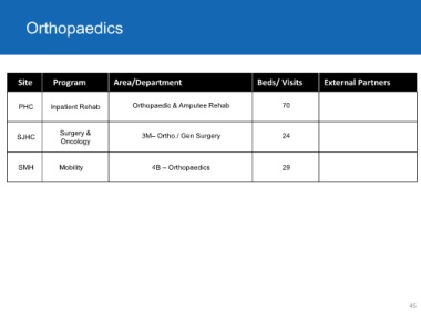Orthopaedics Site Program Area/Department Beds/ Visits External Partners PHC Inpatient Rehab Orthopaedic & Amputee Rehab 70 Surgery & SJHC 3M– Ortho./ Gen Surgery 24 Oncology SMH Mobility 4B – Orthopaedics 29 45