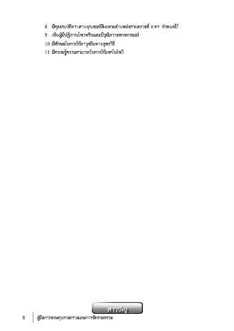 8. มีคุณสมบัติครบตามคุณสมบัติเฉพาะตําแหนงสายตรวจที่ ก.ตร. กําหนดไว 9. เปนผูมีปฏิภาณไหวพริบและมีวุฒิภาวะทางอารมณ 10. มีทักษะในการใชอาวุธปนทางยุทธวิธี 11. มีความรูความสามารถในการใชเทคโนโลยี 8 คูมือการควบคุมสายตรวจและการจัดสายตรวจ