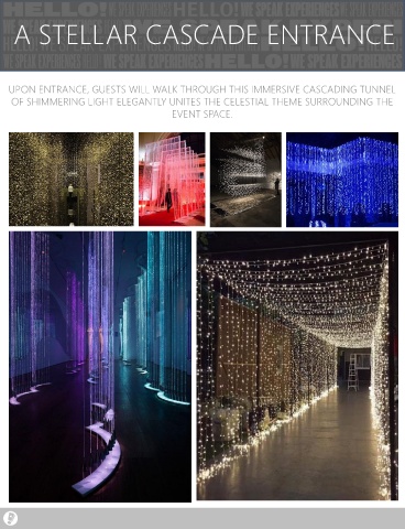 A STELLAR CASCADE ENTRANCE UPON ENTRANCE, GUESTS WILL WALK THROUGH THIS IMMERSIVE CASCADING TUNNEL OF SHIMMERING LIGHT ELEGANTLY UNITES THE CELESTIAL THEME SURROUNDING THE EVENT SPACE.