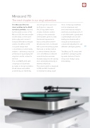 latest addition to the ELAC turntable portfolio. Inspired by the great success of the Miracord 90, the new smaller model draws on the same philosophy and carries it forward. Beneath its elegant exterior, the Miracord 70