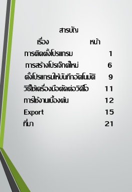 สารบัญ เรื่อง หน้า การติดตั้งโปรแกรม 1 การสร้างโปรเจ็กต์ใหม่ 6 ตั้งโปรแกรมให้บันทึกอัตโนมัติ 9 วิธีใช้เครื่องมือตัดต่อวิดีโอ 11 การใช้งานเบื้องต้น 12 Export 15 ที่มา 21