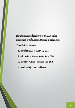 เมื่อลงโปรแกรมเสร็จสิ้นแล้วให้ท าการ Restart เครื่อง คอมพิวเตอร์ จากนั้นเปิดใช้งานโปรแกรม ได้ตามต้องการ • การเปิดใช้งานโปรแกรม 1. คลิกที่ปุ่ม Strat > All Programs 2. คลิก Adobe Master Collections CS4 3. คลิกเลือก Adobe Premiere Pro CS4 4. จากนั้นจะเข้าสู่หน้าแรกของโปรแกรม 2