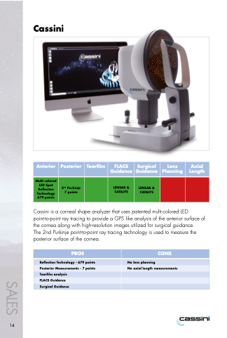 Cassini is a corneal shape analyzer that uses patented multi-colored LED point-to-point ray tracing to provide a GPS like analysis of the anterior surface of the cornea along with high-resolution images utilized for surgical guidance.